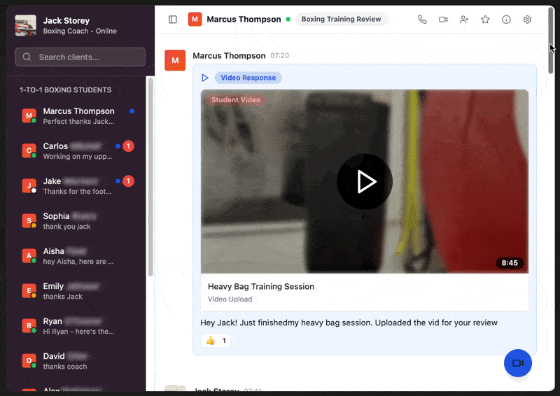 You’ll have a dedicated 1-to-1 chatroom where you can upload videos, ask questions, and get direct feedback anytime.